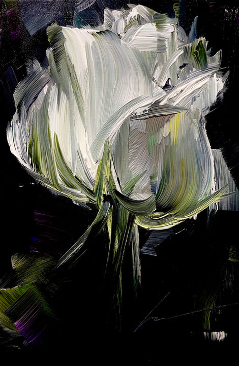 Roses, an iris, a sunflower — familiar images become conduits of another kind of perception. They do not capture the external but open the internal: strength and tension, light and radiance, pulse and stillness. The contrast of dark and bright, dense and transparent, calm and impetuous transforms each canvas into a space where the viewer meets the experience itself.